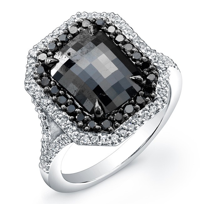 Elegant handcrafted Coby Madison 3.40 Ct Rose Cut Black Diamond center with 98 white and black diamonds in halo design totaling 0.75cts.